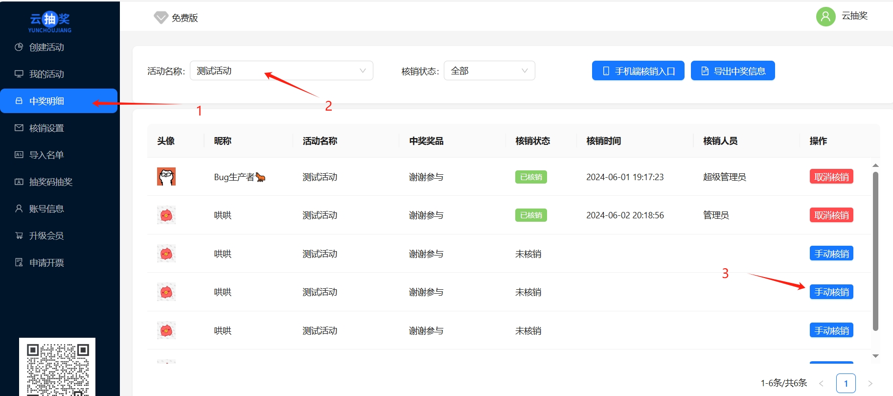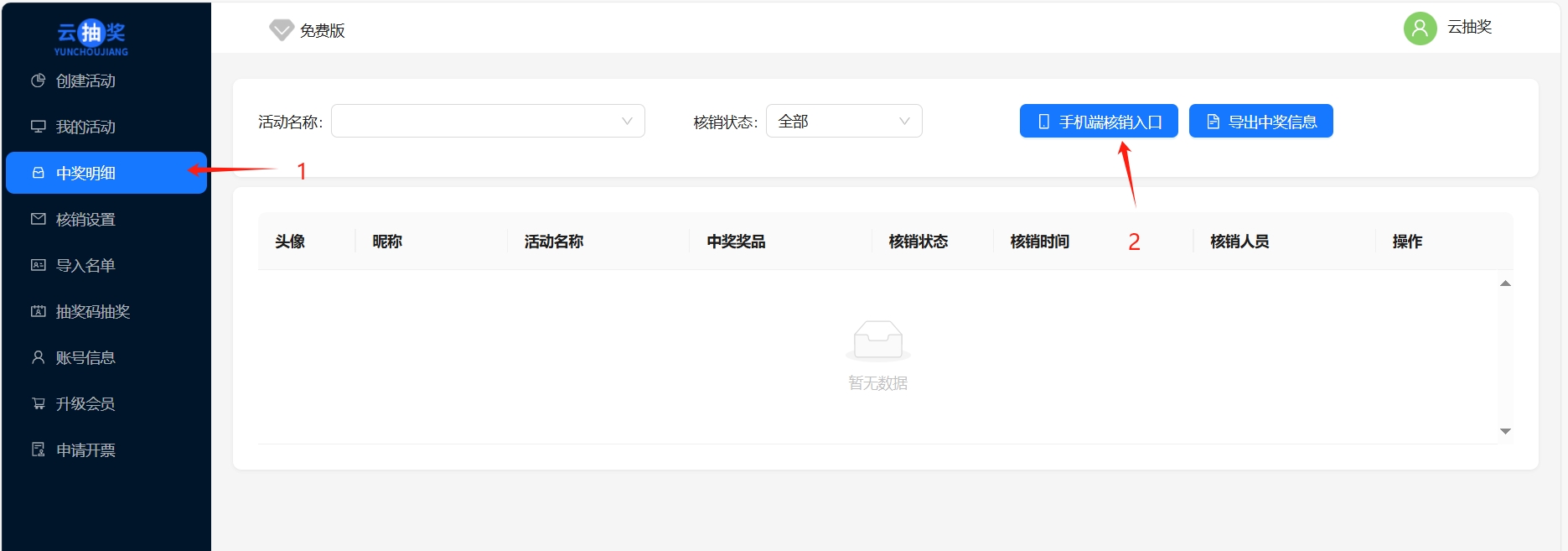 使用场景说明: 当用户中奖后,需要现场兑换奖品时,管理员可根据用户的中奖信息进行核销兑换奖品