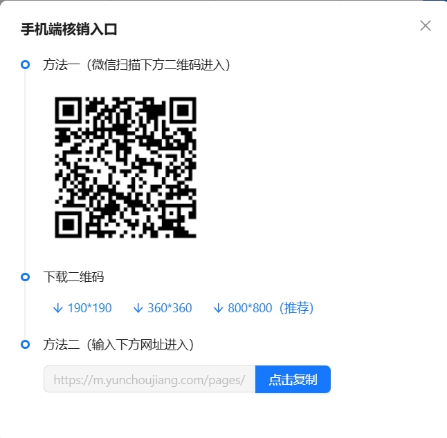 每次核销前,用核销员用手机微信扫码 或 点击链接 进入到核销页面,点击“扫一扫核销”