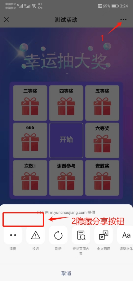 说明:如果设置禁止分享,只能在活动页面里隐藏分享按钮,如下图: